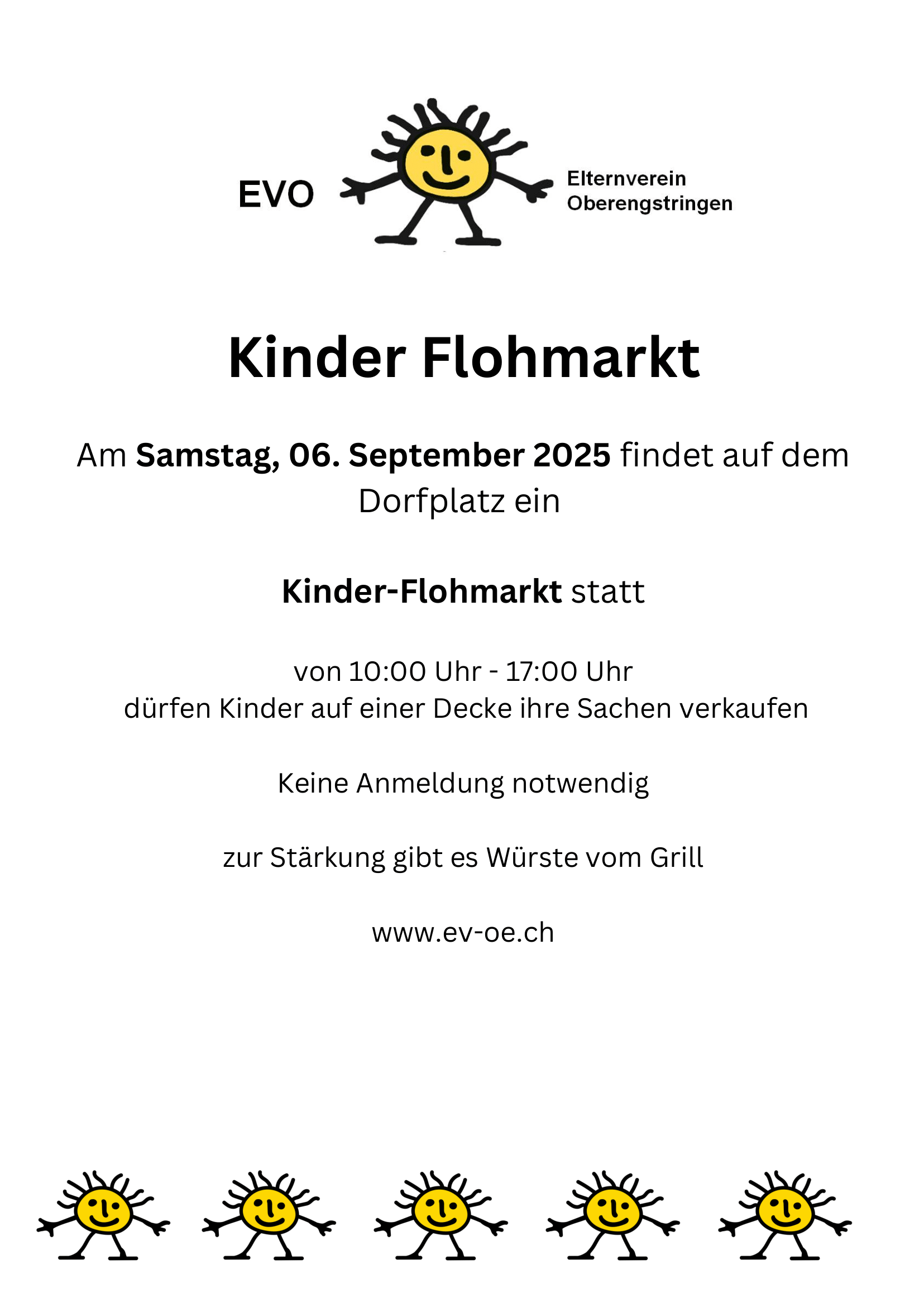 Am Samstag, 06.09.2025 von 10:00 bis 17:00 findet auf dem Dorfplatz ein Kinderflohmarkt statt. Über Mittag werden Grill-Würste verkauft.